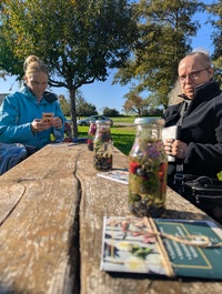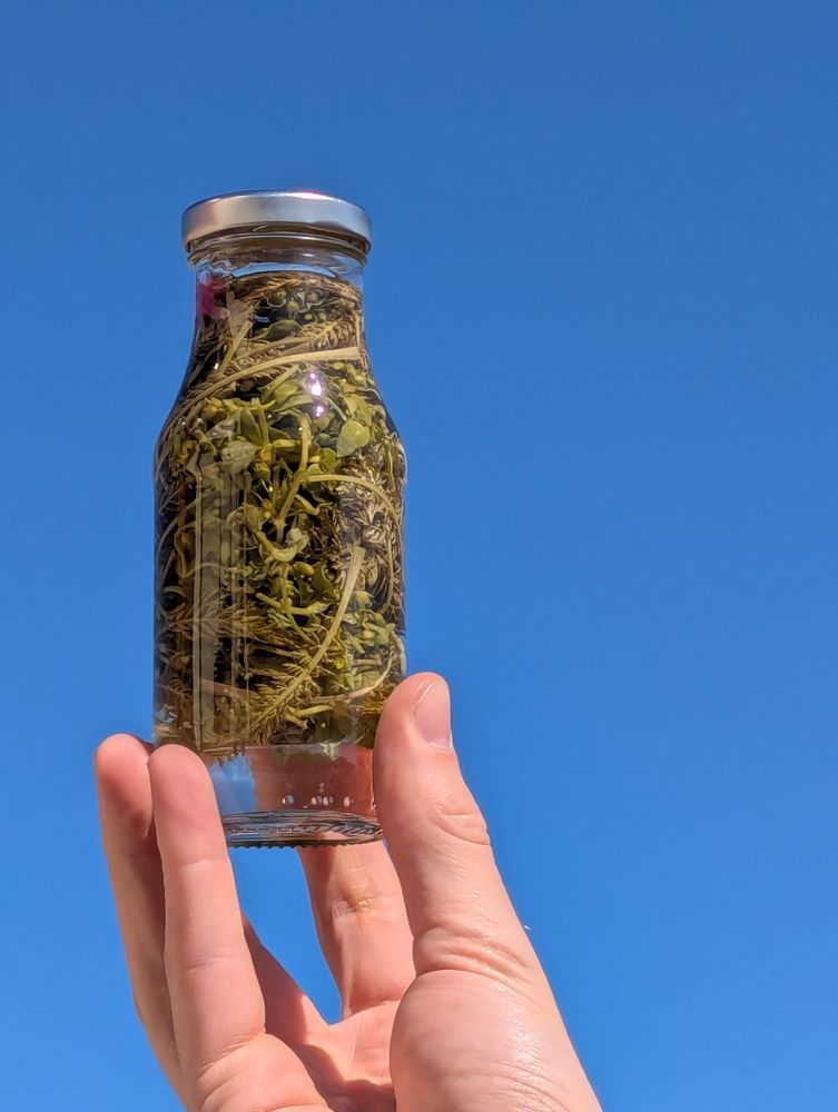 Alles was neben den Kräutern und Wildfrüchten an Material gebraucht wird, wird gestellt und ist in der Teilnahmegebühr enthalten. Bei einer kurzen Rast unterwegs erfrischen wir uns mit leckerer Wiesenlimo.